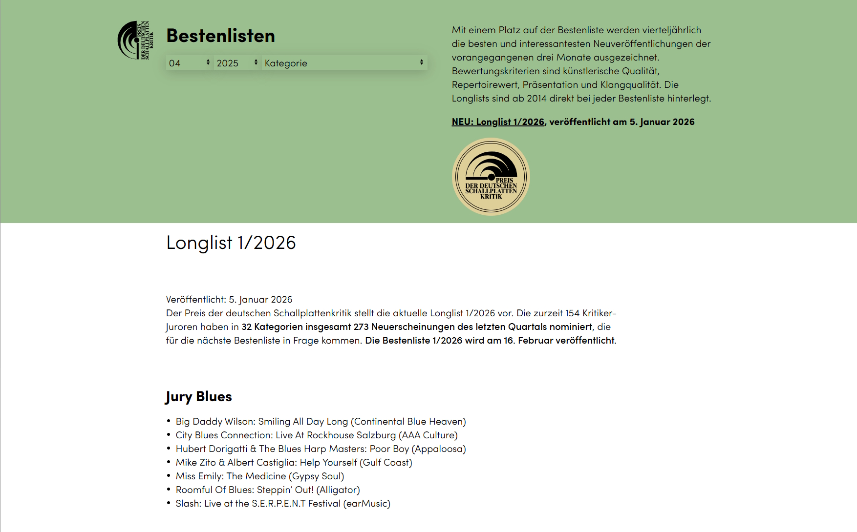 Vielen Dank! Unser aktuelles Album „City Blues Connection – Live AT Rockhouse Salzburg“ wurde für den Preis der deutschen Schallplattenkritik nominiert. Neu sind wir auch zusammen mit sechs anderen Acts in der Longlist dabei. Der aktuelle Stand ist einzusehen via https://www.schallplattenkritik.de/bestenlisten/longlist/longlist-12026, siehe „Jury Blues“ Es ist uns eine Ehre zusammen mit so berühmten Acts, wie zum Beispiel