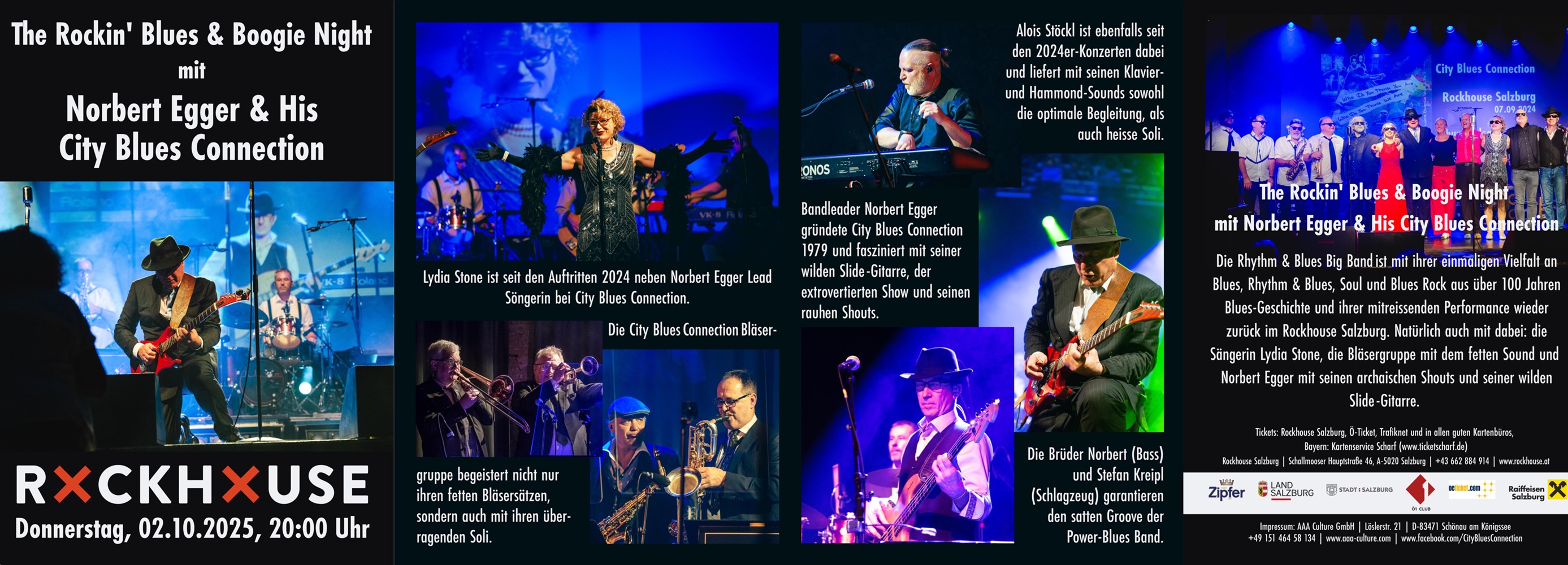 02.10.2025 - City Blues Connection LIVE im Rockhouse SalzburgThe Rockin' Blues & Boogie Night!Beginn: 20 Uhr Das Konzert findet im Saal statt. Die Veranstaltung ist teilweise bestuhlt. Bitte kommen Sie rechtzeitig, falls Sie einen Sitzplatz benötigen. Tickets: |